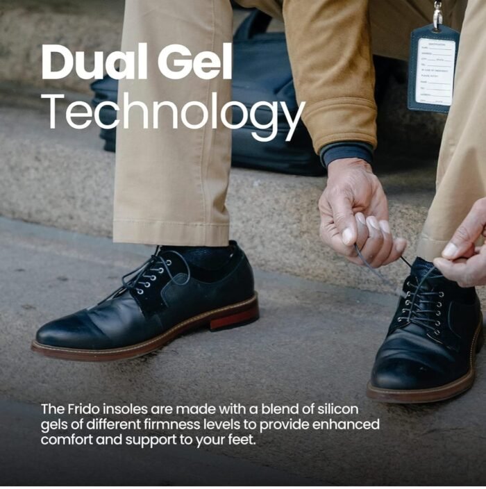 - TRIPLE ZONE COMFORT: The enhanced cushioning and support along with a deep heel cup assure your foot complete comfort. The deep heel cup to distribute your bodyweight uniformly. ANTI-SWEAT FABRIC: Frido Dual Gel Insoles have fabric that keeps microbes at a bay making your foot sweat-free. Keeps your foot fresh and comfy.