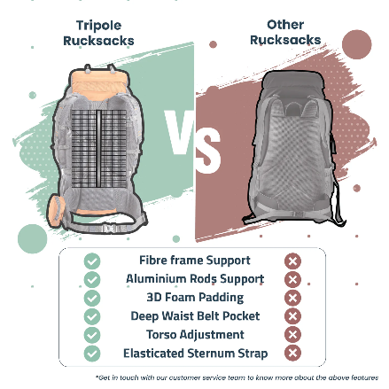 - INTERNAL FRAME SUPPORT- Engineered for serious trekking and backpacking, the Tripole Walker Rucksack features a durable fibre internal frame supported by an aluminum rod. This rugged structure ensures optimal load balance, reducing pressure on your back and shoulders during long hikes, mountain climbs, or travel expeditions. Ideal for outdoor adventurers who demand both strength and support.