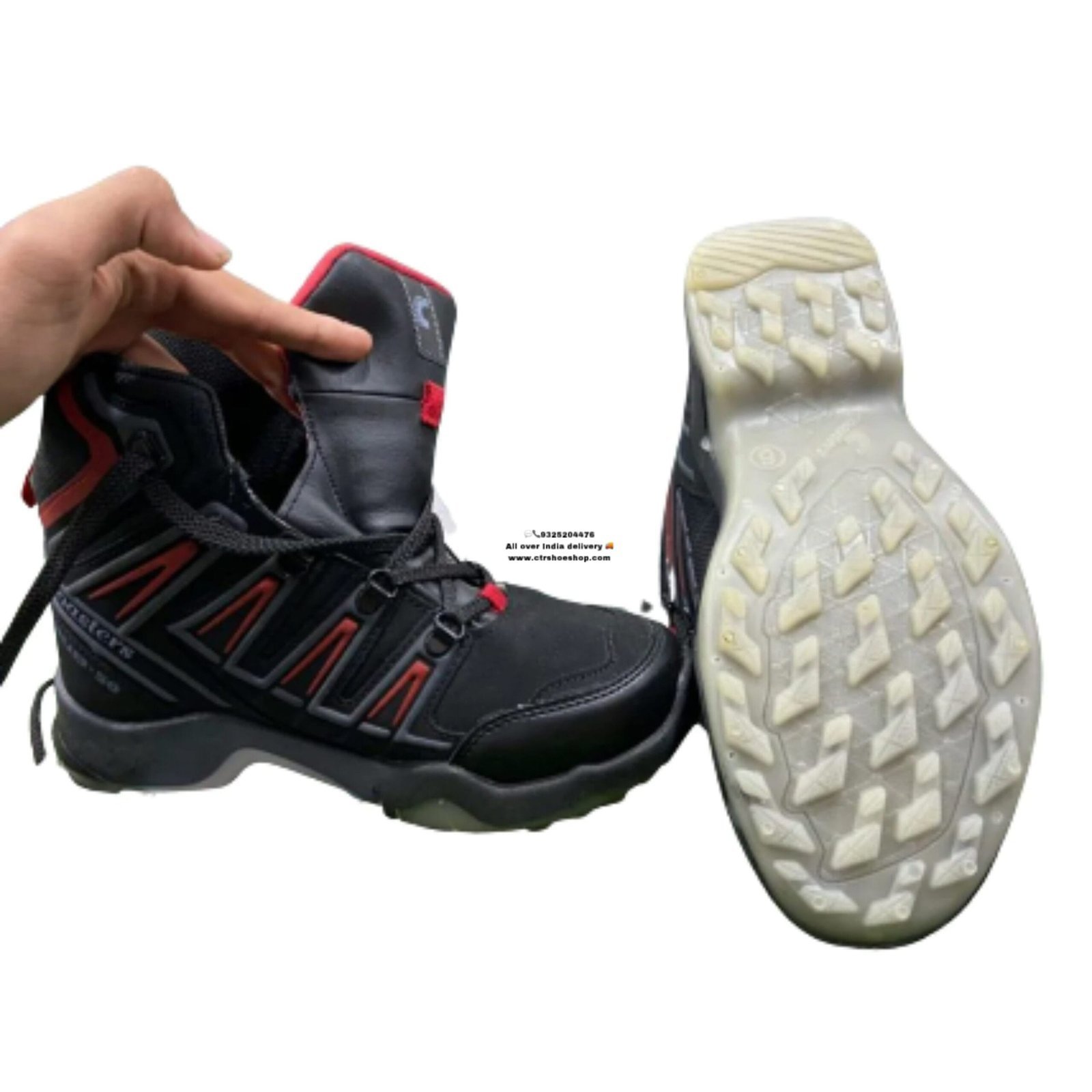 Anti slip Waterproof Ctr Trekking shoes in action Snow trekking ( Black-Red) Rub-50